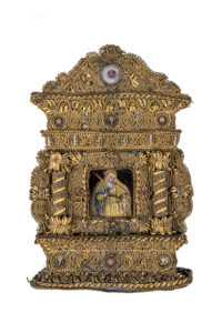 Piccolo oggetto devozionale eseguito con una particolare lavorazione del nastro dorato che ricopre interamente la struttura in legno seguendo elaborati motivi ornamentali, l'insieme funge da cornice a immaginette religiose o piccole reliquie. I primi esempi di questi oggettini di arte religiosa in materiali poveri risalgono alla prima metà del XVII secolo ed erano diffusi soprattutto nei conventi femminili.