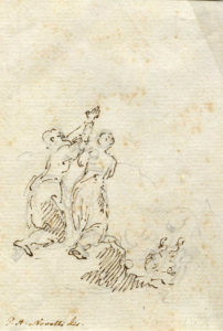 Pietro Antonio Novelli [attribuito a], Studio per due figure oranti / Studio di mano con fiore. — Penna e inchiostro bruno su carta vergellata sottile color avorio priva di filigrana. mm 48x48 /105x75.