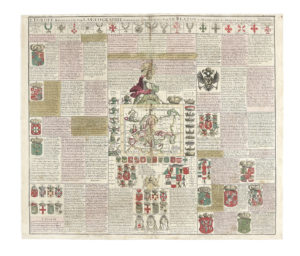 Grande foglio di testo inciso con una mappa dell'Europa al centro sormontata da una figura di atlante, all'interno del foglio trovano posto le illustrazioni dei blasoni dei reali europei, delle repubbliche, degli ordini ecclesiastici e degli ordini cavallereschi, e emblemi araldici.