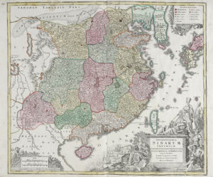 È raffigurata anche Formosa, odierna Taiwan. In basso a destra imponente cartiglio allegorico per il titolo con gli dei Atena, Ermes e Poseidone, e l'Europa che indica le navi mercantili e le ricchezze simbolo del commercio con la Cina.