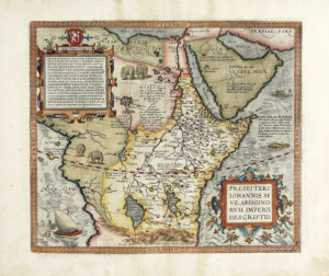 Abraham Ortelius, Presbiteri Johannis, Sive, Abissinorum Imperii Descriptio. Antwerp : 1609-1612. — Incisione in rame in coloritura. mm 374x440. — Foglio : mm 470x570. Mappa dell'immaginario regno di Giovanni Presbitero in Abissinia, dall'edizione
