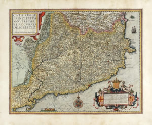 Abraham Ortelius Johannes Baptista Vrients, Cataloniae Principatus Novissima et Accurata Descriptio. Antwerp : Ioannes Baptista Vrints, 1609-1612. — Incisione in rame in coloritura. mm 387x490.— Foglio : mm 470x577.
