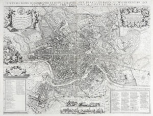 Veduta panoramica di Roma, basata sulla Nuova Pianta et alzata della città di Roma in 12 fogli di Giovanni Battista Falda, pubblicata per la prima volta nel 1676. La mappa abbraccia tutta la città entro le antiche Mura Aureliane.