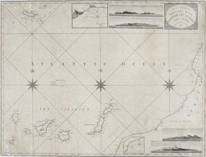Rara carta nautica edita agli inizi del discontinuo periodo di attività di Robert Blanchford. Rilievo accurato ricco di dettagli con riquadri contenenti le mappe della Baia di Funchal e della Baia di Santa Cruz oltre a quattro vedute rettangolari in orizzontale con la parte Sud Ovest di Madeira e di Porto Santo, Tenerife con il suo picco, e la Isleta di Gran Canaria.