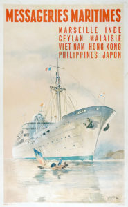 Manifesto della linea di navigazione Messageries Maritimes, compagnia di navigazione mercantile francese creata nel 1851 come Messageries nationales (in seguito chiamata Messageries impériales, e dal 1871, Compagnie des messageries maritimes, casualmente conosciuta come "MesMar" o con le sue iniziali "MM"), che promuove i viaggi in Estremo Oriente con le proprie navi su rotte dirette verso l'Asia negli anni '50. Il manifesto, su disegno di Jean des Gachons, mostra una nave combinata (merci e passeggeri) che rallenta passando davanti a un piccolo sampan vietnamita.