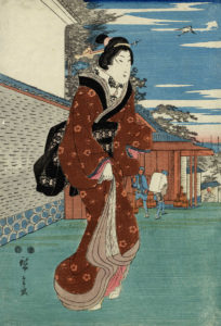 Utagawa Hiroshige I, Bijin fuori dalla residenza del signore feudale Kuroda a Kasumigaseki. — 1848 ca. — [edizione fine XIX secolo]. — Xilografia a colori (nishiki-e). — Formato : ôban verticale (mm 355x244, tavola di sinistra di trittico).