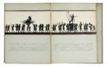 cartoncini rigidi di mm 120 di altezza, stampate in litografia a leporello., che tutte unite e ripiegate illustrano un corteo nel quale l'artista poeta e iniziato é accompagnato da una moltitudine di fanciulli festanti e animali.