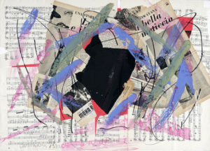 Arturo Carmassi, Senza titolo. — 1986. — Tempera su ritagli di giornale e spartiti musicali. cm 50x70.