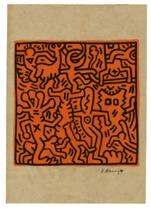 Firma in basso a destra e, al verso, timbro a inchiostro blu di certificato di autenticità del Keith Haring Estate, con informazioni aggiuntive e firma di Julia Gruen a penna nera.