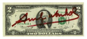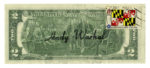 Andy Warhol, 2 dollars signed by Andy Warhol. — 1976. — Firma manoscritta a pennarello nero su banconota da due dollari. mm 67x154.