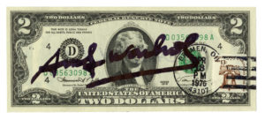 Andy Warhol, 2 dollars signed by Andy Warhol. — 1976. — Firma manoscritta a pennarello nero su banconota da due dollari. mm 67x154.