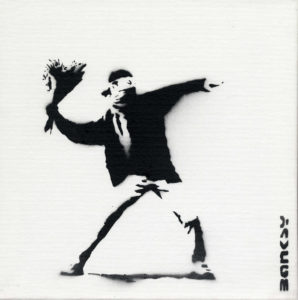 Banksy, Dismaland. The Flower Thrower. — 2015. — Vernice spray su tela. cm 30x30.