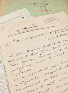 L'AUMÔNE. — Ensemble complet de ce texte paru dans la Nouvelle Revue Française dans le numéro de mai 1925. — 13 pages in-4 dont les deux premières sont manuscrites, les 11 suivantes dactylographiées avec corrections manuscrites et ajouts en...