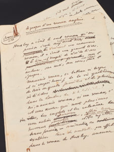 A PROPOS D'UN ROMAN ANGLAIS. — Manuscrit autographe complet de la critique du roman Contrepoint d'Aldous Huxley, parue dans la Nouvelle Revue Française de novembre 1930. — 23 pages in-4, nombreuses ratures et corrections pour ce texte élogieux...