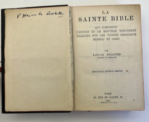 Nouvelle édition revue de la traduction de Louis SEGOND, réputée pour être une des plus belles et respectueuses possibles du texte original. Ex-libris manuscrit : signature « P. Drieu la Rochelle » en page de garde, pas de commentaire écrit mais quelques traits au crayon rouge en marge soulignant quelques passages. Reliure d'éditeur in-12, dos éclairci, manque en coiffe et en queue, charnières fendue, tenant par un morceau de scotch, intérieur frais.