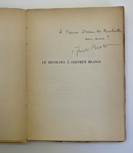 BRETON André — Le revolver à cheveux blancs. — Ed. des Cahiers Libres Paris 1932. — E.O. en S.P. — Envoi d'André Breton, « A Pierre Drieu la Rochelle, son ami ? André Breton ». — Broché in-8, dos jauni et fragile, couvertures piquées.