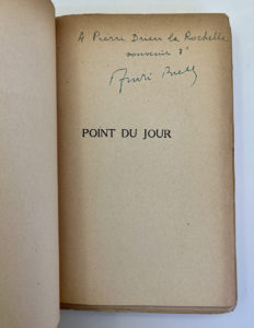 BRETON André — Point du jour. — Gallimard Paris 1934. — E.O. en S.P. (pas de grand papier. — Envoi « A Pierre Drieu la Rochelle, souvenir d'André Breton ». — Broché in-12, dos jauni.