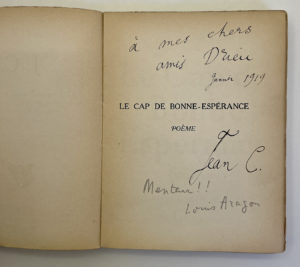 COCTEAU Jean — Le cap de bonne espérance. — Editions de la Sirène Paris 1919. — E.O. — L'un des 500 ex. sur Papier bouffant, 2ème papier après 10 vieux Japon. Envoi « A mes chers amis Drieu », complété par une dédicace manuscrite de...