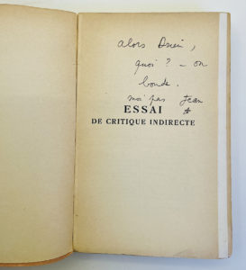 COCTEAU Jean — Essai de critique indirecte. — Grasset Paris 1932. — E.O. en S.P. — Envoi « Alors Drieu quoi, On boude ? Moi pas ». — Broché in-12, petit manque en haut de dos.