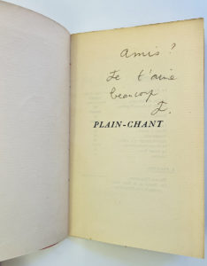 COCTEAU Jean — Plain-chant. — Stock Paris 1923. — E.O. — Envoi à Drieu la Rochelle, « Amis ? je t'aime beaucoup ». — Broché in-12, dos éclairci avec petit manque.