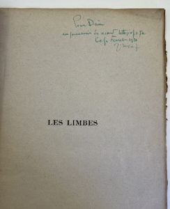 CINGRIA Charles Albert — Les limbes. — Editions Jeanne Bucher Paris 1930. — E.O. — L'un des 20 ex. H.C. sur Montval. — Illustrations de 9 pointes sèches de Jean LURCAT. — Envoi à Pierre Drieu la Rochelle de Lurçat, « en souvenir du...