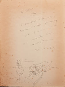 DESNOS Robert — The night of loveless nights. — Anvers 1930. E.O. — L'un des 100 ex. sur Arches. — Superbe envoi pleine page accompagné d'un dessin de Desnos à Pierre Drieu la Rochelle daté de février 1932. — Illustrations de MALKINE....