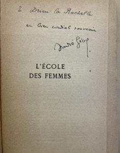 GIDE André — Ensemble de 5 ouvrages avec dédicaces à Drieu la Rochelle (1 avec signature manuscrite de Drieu en page de garde uniquement). — Brochés in-12, état mauvais, tous en S.P. 4. de GIDE : Perséphone / L'école des femmes / Le retour...