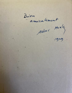 HUXLEY Aldous — Do What you will. Chatto & Windus London 1929. — E.O. — Envoi autographe signé « Drieu / amicalement / Aldous Huxley / 1929 ». — Reliure d'éditeur in-12 pleine toile orangé à la bradel, dos très légèrement insolé.