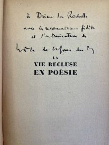 LA TOUR DU PIN Patrice de — Ensemble de 5 ouvrages tous dédicacés à Pierre Drieu la Rochelle. — Broché in-12 ou in-8, couvertures jaunies, la plupart en S.P. : Psaumes / L'enfer / La vie recluse en poésie / Les anges / La quête de la joie.