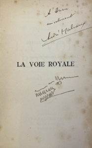 MALRAUX André — La voie royale. — Grasset Paris 1930. — E.O. en S.P. — Envoi avec un dessin de loup, « A Drieu amicalement ». — Broché in-12, dos jauni et plats détachés.