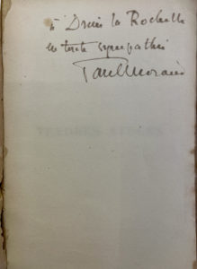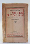 MORAND Paul — Tendre stocks. — NRF Paris 1921. E.O. L'un des ex. sur Pur fil, seul grand papier après les réimposés. — Envoi « a Drieu la Rochelle en toute sympathie ». — Préface de Marcel Proust. — Broché in-12, dos fragile, manque...