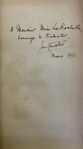 ENSEMBLE DE 10 OUVRAGES tous dédicacés à Drieu la Rochelle. — Brochés in-12 ou in-8, mauvais état.