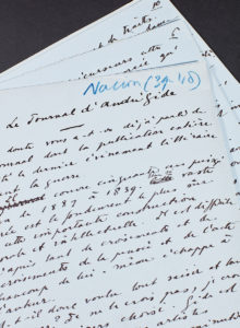 LE JOURNAL D'ANDRÉ GIDE. — Manuscrit autographe complet de son article paru dans le journal chilien La Naciòn du 31 décembre 1939. — 12 pages in-4, ratures et corrections, dans lesquelles il salue le Journal comme l'œuvre de Gide la plus...
