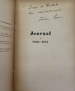 GREEN Julien — Ensemble de 2 ouvrages dédicacés à Drieu la Rochelle. — E.O., brochés in-8, couvertures jaunies : Journal 28-34 / Le visionnaire.