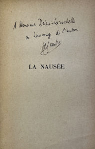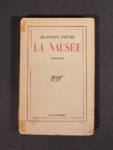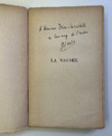 SARTRE Jean-Paul — La nausée. — Gallimard Paris 1938. — E.O. en S.P. — Envoi, « A Monsieur Drieu la Rochelle, en hommage de l'auteur ». — Broché in-12, dos avec manque et trace de scotch.