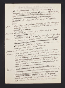 AMÉRICAINES ET EUROPÉENNES. — Manuscrit d'un dialogue entre deux protagonistes, Pierre et James, sur l'Acropole. — 4 pages in-4, nombreuses ratures et rajouts au crayon à papier.