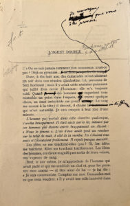 L'AGENT DOUBLE : tapuscrit complet de 7 pages in-8 recto-verso avec corrections manuscrites, ratures, ajouts en marge, dernières retouches avant sa publication en juin 1935 dans la NRF ; joint le tapuscrit de 7 pages in-4.