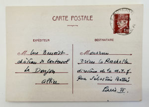 BENOIST Luc — Carte autographe signée et adressée le 19 septembre 1942. — Il le remercie d'avoir fait publier dans la NRF son étude sur René Guénon et lui confirme qu'il passe à la campagne dans l'Allier un agréable moment en lisant Beloukia.