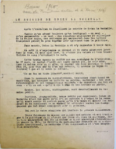 BERNIER Jean — Tapuscrit original du texte intitulé, « le suicide de Drieu la Rochelle ». — 5 pages in-8 avec annotation manuscrite en tête de texte.