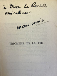 Envoi, « A Drieu la Rochelle amicalement ». Broché in-12, dos jauni.