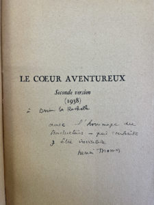 Envoi du traducteur Henri THOMAS « A Drieu la Rochelle avec l'hommage du traducteur qui souhaite y être invisible ». Broché in-12, couverture jaunie.