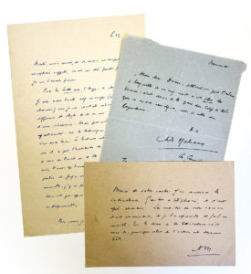 MALRAUX André — 3 lettres autographes signées et adressées à son ami. — Deux cartes postales de février et septembre 1941 où il fixe des rendez-vous à son ami, la seconde lettre se terminant par cette phrase prémonitoire, « que le dieu...