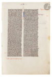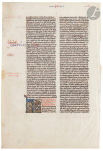 Feuillet extrait de la «Chudleigh Bible», dont plusieurs feuillets sont dans des collections institutionnelles. Cette Bible est nommée ainsi d’après un possesseur antérieur: Charles Oswald Hugh Clifford (1887-1962), 11e Baron Clifford of Chudleigh. La Bible fut vendue par Sotheby’s, The Property of the Lord Clifford of Chudleigh, 7 décembre 1953, lot 51. Le lot fut acquis par le libraire Maggs. Cette Bible fut de nouveau vendue par Sotheby’s, 8 juillet 1970, lot 104; puis Christie’s, 11 juillet 1974, lot 18.