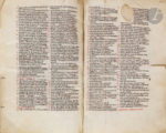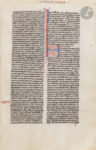complet [collation: i16, ii16, iii16, iv16, v16, vi16, vii18, viii16, ix20, x12, xi16, xii16, xiii16, xiv16, xv18, xvi16, xvii16, xviii16, xix16, xx16, xxi14, xxii16, xxiii10, xxiv11 (12-1)], fine écriture gothique, texte sur deux colonnes, réglure à la mine de plomb (justification 140x86 mm), quelques réclames (en partie rognées, par exemple f. 148v), quelques signatures anciennes (chiffres romains au bas des marges inférieures, par exemple f. 95, f. 113, f. 129), titres courants en lettres capitales en rouge et bleu dans les marges supérieures (certains titres courants rognés), signes de paragraphe bleus ou rouges en alternance, chapitres «modernes» indiqués dans les marges en chiffres romains à l’encre rouge et bleue, chapitres «anciens» signalés dans le corps du texte par des initiales peintes en bleu ou rouge, plus grandes initiales peintes en rouge ou bleu (parfois aussi initiales «puzzle») avec décor filigrané bleu ou rouge (introduisant en majorité les prologues), très grandes initiales «puzzle» en rouge et bleu avec décor filigrané bleu et rouge marquant le début des livres bibliques, petites initiales peintes en rouge pour les «Interprétations des noms hébreux», nombreuses annotations marginales et/ou corrections (mains contemporaines ou proches contemporaines).