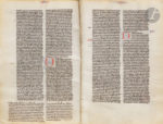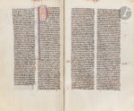 1 - Manuscrit copié et décoré très certainement dans le Nord de la France, sans doute Paris. La séquence des livres bibliques et des prologues retenus dans ce manuscrit correspond à la « Bible de Paris » élaborée à partir de 1200 (« Proto-Paris Bible » ; voir L. Light, 1994, 2011, 2012) et fixée avec ses chapitres modernes à partir de 1230 environ. D’un point de vue de datation, ce manuscrit semble avoir été copié assez tôt, vers 1230-1240 car il maintient encore les anciens chapitres indiqués au moyen d’initiales peintes en rouge ou bleu dans le corps du texte (non numérotés), tout en fournissant les chapitres « modernes » dans les marges extérieures (chiffres romains rouges et bleus). En revanche les « listes de capitules » (« capitula lists ») ont entièrement disparus dans ce manuscrit. Cette datation vers 1230-1240 est corroborée par le style des initiales filigranées qui correspondent au type de filigranes recensés et datés par P. Stirnemann, vers 1230-1250 (voir Stirnemann, 1990, cat. 25 à 30, ce dernier cat. 30 ce dernier cat. 30 est un Missel à l’usage des dominicains, datables vers 1233-1243 ; le cat. 25 est une Bible dont les Interprétations des noms hébreux sont datées 1234).