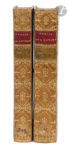 Bel exemplaire en reliure de l’époque, très bien conservé malgré une petite fente sans gravité à une charnière. Étiquette ancienne de bibliothèque collée au dernier caisson de chaque volume. Rousseurs à certaines planches causées par la serpente.
