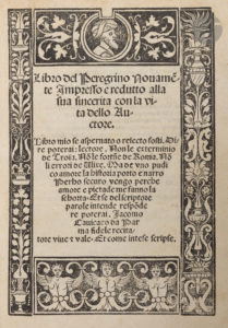 «Il Libro del Peregrino est une œuvre narrative en prose atypique. Seule composition en langue vulgaire d’un ecclésiastique au parcours chaotique, Giacomo Caviceo, ce récit à la première personne relate les amours contrariées de Peregrino pour Genevra, dont les aventures rocambolesques et les errances portent sans doute la trace de celles, réelles, de leur auteur. Rédigé dans la dernière décennie du XVe siècle, l’ouvrage est publié à Parme en 1508, puis en 1513 à titre posthume: preuve de son succès, il connaîtra vingt et une éditions au total jusqu’en 1559, principalement à Venise et Milan, et suscitera plusieurs imitations» (Mathilde Thorel, La Première réception du Peregrin en France, in: Réforme, Humanisme, Renaissance, n°75, 2012, p. 88).