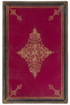Maroquin bleu foncé, filet à froid en encadrement sur les plats, dos à nerfs, cadre de maroquin bleu foncé orné de filets dorés à l’intérieur, doublures de maroquin rouge orné d’un décor doré composé de filets en encadrement, de fleurons aux angles et d’une composition centrale filigranée en losange, tranches dorées sur marbrures (A. Chatelin).