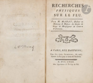 MARAT (Jean-Paul). — Recherches physiques sur le feu. — Paris : Cl. Ant. Jombert, 1780. — In-8, 208x134 : (2 ff.), 202 pp., (1 f.), 7 planches.