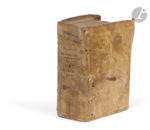 La reliure est en partie défaite, les coutures de la charnière du premier plat ont laché. Manque les liens. Quelques taches et trous de vers. Déchirures sans manque restaurées au second feuillet. Déchirure avec manque au bas du feuillet HH2, n’atteignant que le chiffre de la signature. Mouillures claires à plusieurs feuillets.
